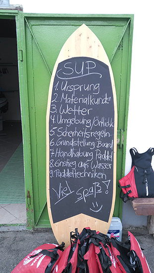 Theorie: Ursprung Sup, Materialkunde, Wetter, Sicherheitsregeln, Übungen zur Haltung